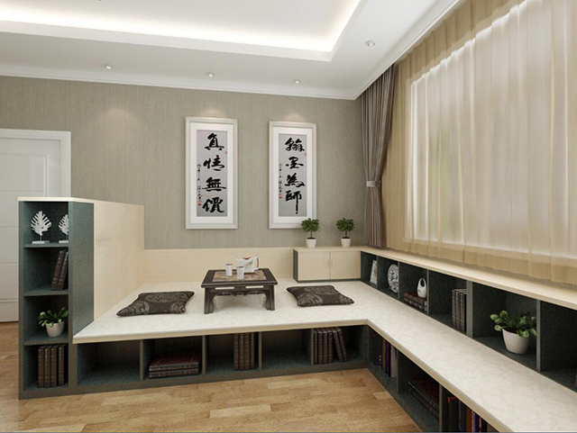 如果你家的飄窗面積足夠大。采光、通風(fēng)、視野都很好,那你可以把飄窗設(shè)計(jì)成一個(gè)多功能的休閑區(qū)。這樣的飄窗相對(duì)來說比較普遍,客人來了可以坐在著喝喝茶聊聊天,視野寬闊,生活雅致而又韻味。
