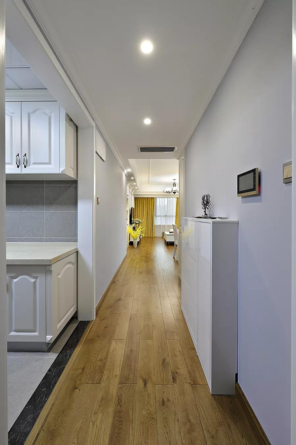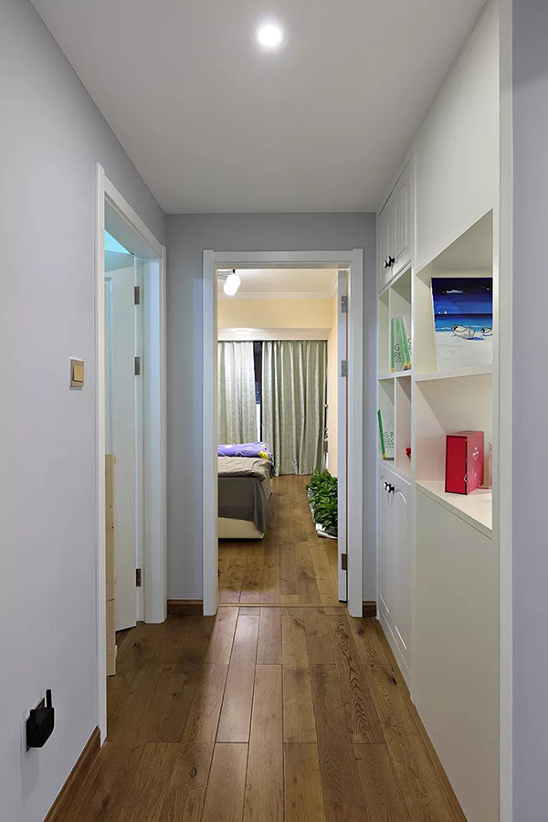 用過道空間做了入墻式的收納柜,既增加室內的收納空間,又不妨礙活動空間,結合復古木色與白色,讓原本單調的走廊也顯文藝愜意。