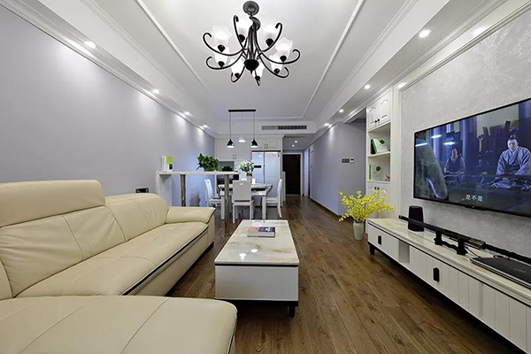 米色皮質L型沙發(fā),溫馨舒適,易清潔,搭配白色實木茶幾,看上去就很舒服了。