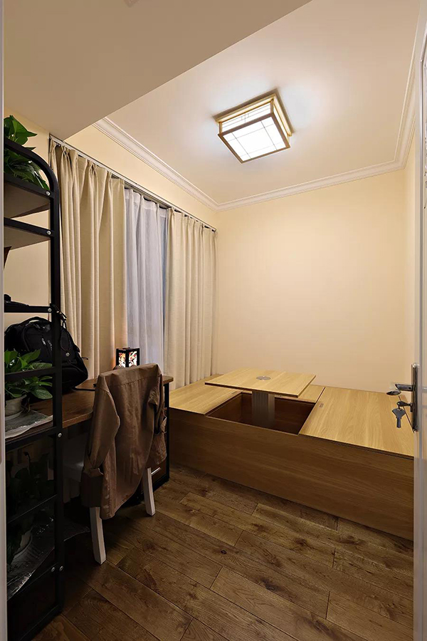 采用了升降式的榻榻米床,睡覺時從柜子里取出床褥便可休息,不睡覺時,把床鋪收起,把隱藏的小桌子拉上來,就成了一個自由舒適的茶話室。