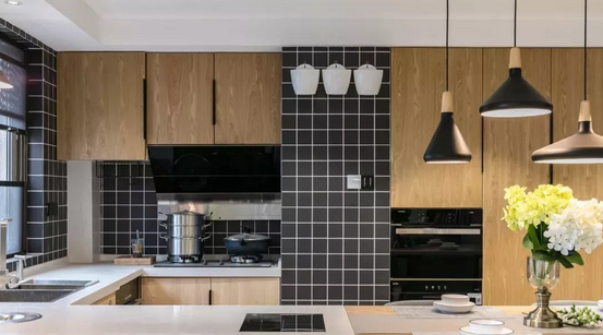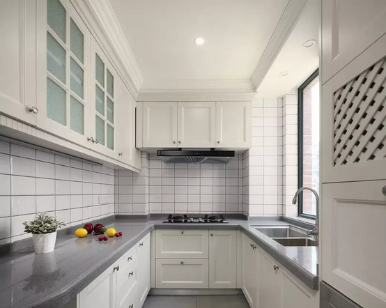 純白可能有些單調(diào),這個時候可以用局部亮點來點綴:餐具、臺面、電器、花卉都是搭配利器。后擋板也有無限創(chuàng)造性,大理石,花磚、馬賽克……你想得到的都可以用得上。