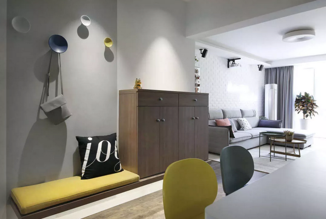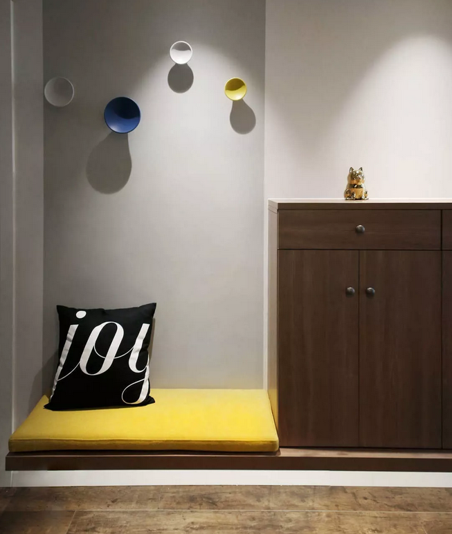 換鞋座與鞋柜都做了掛墻式,沒有落地柜腳的障礙,掃地擦地順暢很多;由于門廳光線弱,柜體離地也有利于客廳的光線更多的傳遞到門廳。當然輔助光源一樣不可少。