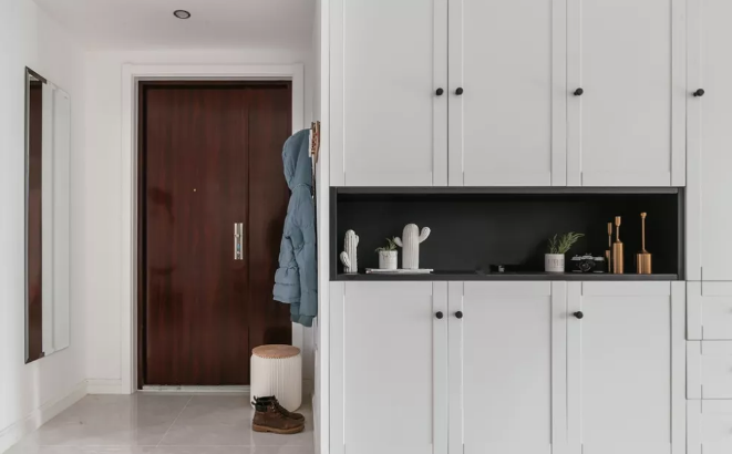 嵌入式鞋柜一般是和進門吊頂結(jié)合設(shè)計的,不僅美觀實用而且可以大大節(jié)省室內(nèi)空間。利用墻面的空間,在考慮墻體的承重范圍下,在玄關(guān)處設(shè)計嵌入式鞋柜,能夠保證鞋柜足夠安全。