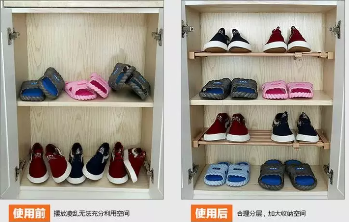 可調(diào)節(jié)層板的實現(xiàn)方式有很多種,小編最推薦的是使用伸縮桿,一層變兩層,高度可以根據(jù)鞋幫高度來調(diào)整。