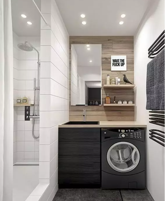 還有一個(gè)優(yōu)點(diǎn)是洗衣機(jī)放衛(wèi)生間,洗衣機(jī)的排水也不用做得太過(guò)于復(fù)雜,裝個(gè)排水管就可以,因?yàn)樾l(wèi)生間的先天性條件就是排水系統(tǒng)做得很到位。