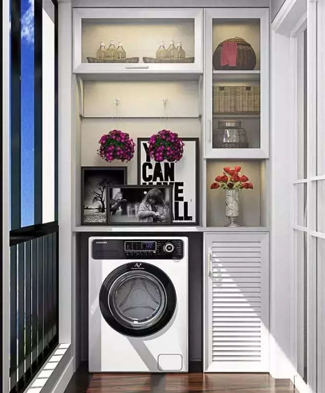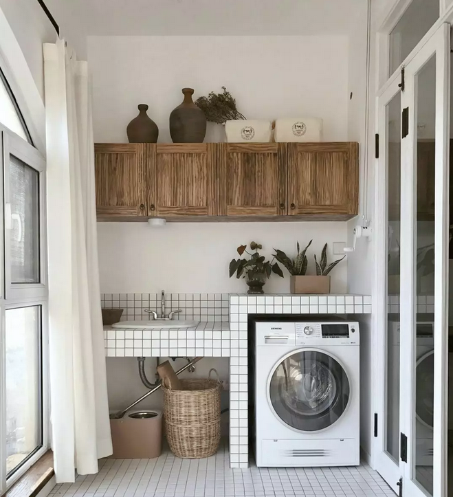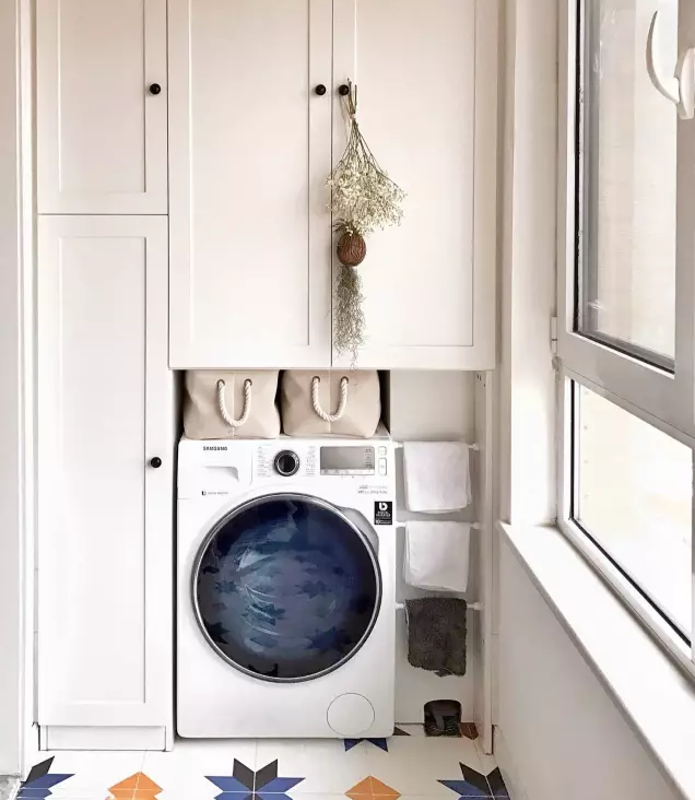 衛(wèi)生間面積不夠,或者覺(jué)得陽(yáng)臺(tái)放洗衣機(jī)比較方便的小伙伴 ,也可以考慮把洗衣機(jī)放陽(yáng)臺(tái),這樣洗完直接晾曬。