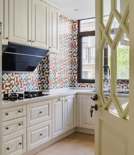 廚房的墻面一般比較單調(diào),實(shí)用性遠(yuǎn)遠(yuǎn)勝過了裝飾性,因而沒有太大的亮點(diǎn)。如果用花磚進(jìn)行裝飾,和其他單色磚形成一個視覺上的對比,或許就能輕松打造視覺焦點(diǎn)了。