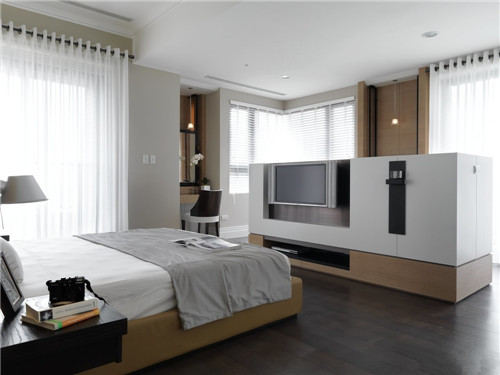 臥室、洗手間一柜分離:在打造主臥過程中,如何能更大利用空間?比起裝一道門來分隔衣帽間和臥室,用兩扇柜子門是不是更簡(jiǎn)單?現(xiàn)在是打開的,合上就會(huì)變成一道門。