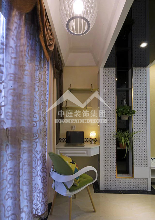 將陽(yáng)臺(tái)用玻璃和木材封閉成居家小書房,窗外的綠葉仿佛伸手可及,好像馬上就會(huì)進(jìn)入居室,自然與居室就這樣在陽(yáng)臺(tái)這個(gè)小小空間相交融。為了節(jié)約空間,可將書桌、書架和文件柜都設(shè)計(jì)得很小巧別致,既提供了完善的實(shí)用功能,又不多占空間。