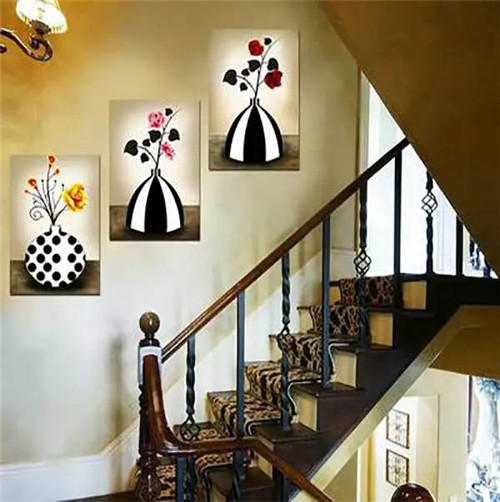 走廊和樓梯空間很容易被人忽略掉,但其實這些空間非常重要,而類似這種狹長空間,可以選擇同主題的組合畫。樓梯懸掛時可以高低錯落,順勢而掛。