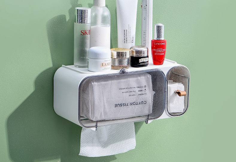 左邊是磁吸設(shè)計,洗臉巾抽取式,輕松快捷;右邊是手拉式,方便增添化妝棉;右側(cè)面有掛鉤,可懸掛頭箍、手鏈、項鏈等物品;頂部置物,可放日常的護膚用品。