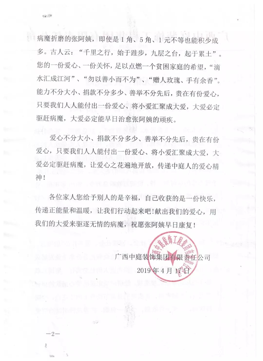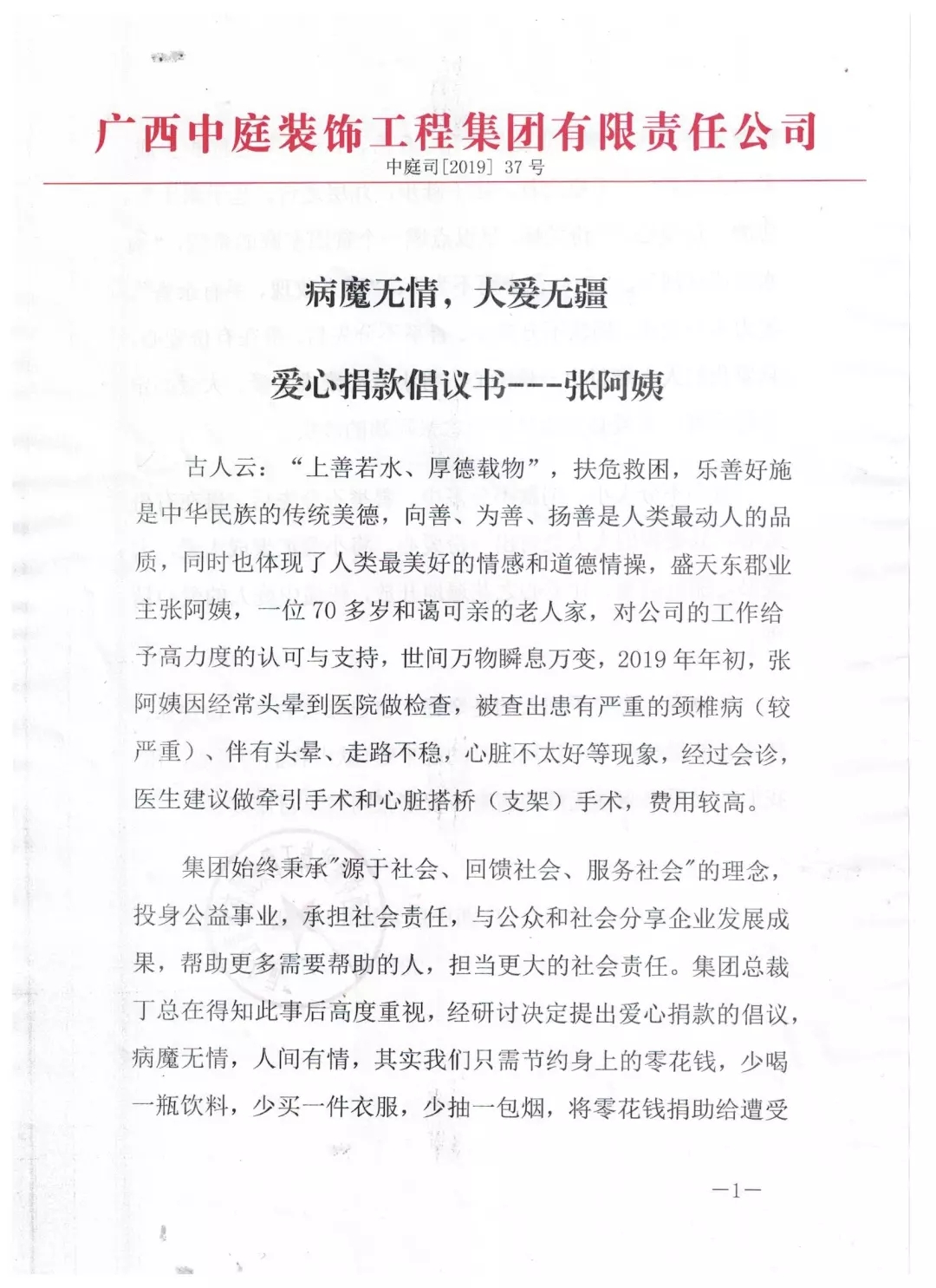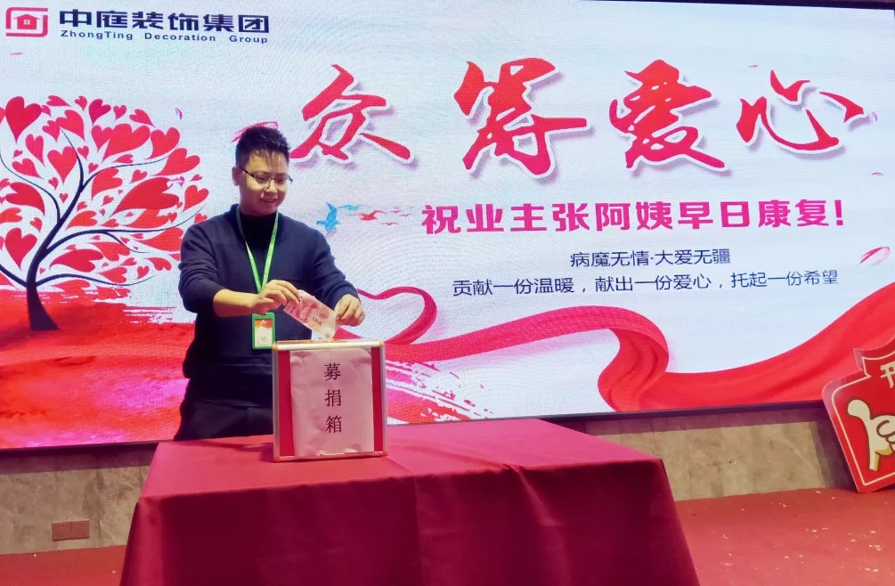 集團總裁丁胡先生向全體員工號召,為張阿姨獻出一份愛心。捐款不分多少,貴在有份愛心,只要我們人人都能付出一點愛、將小愛匯聚成大愛,大愛必定驅趕病魔,大愛定能早日治愈張阿姨的疾病。