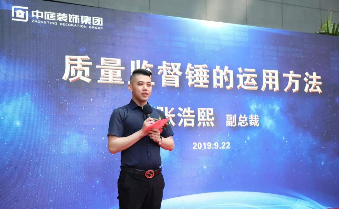 ▲集團副總裁張浩熙先生向業(yè)主代表授予質(zhì)量監(jiān)督錘,并講解質(zhì)量監(jiān)督錘的運用方法。