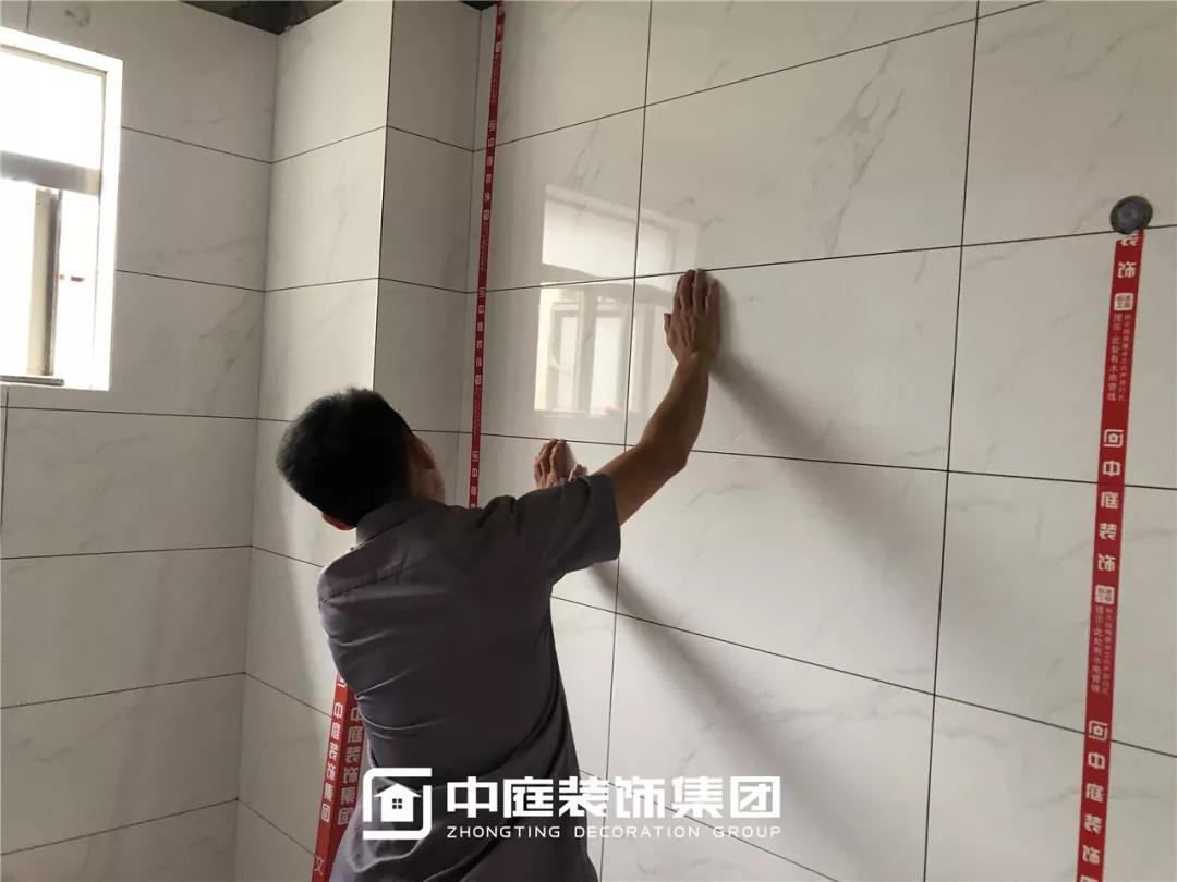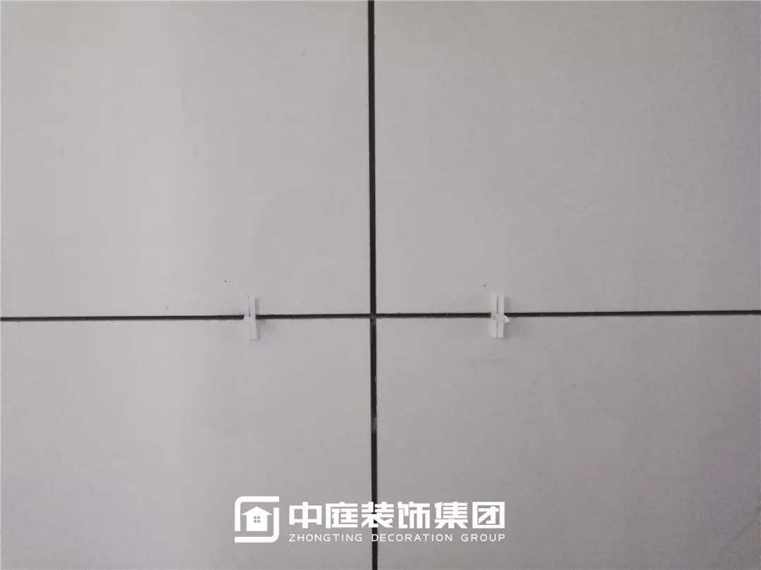 十字卡扣留縫鋪貼,對(duì)縫整齊。(瓷磚留縫可防止瓷磚在熱脹冷縮中出現(xiàn)起鼓、開裂、翹邊等情況。)