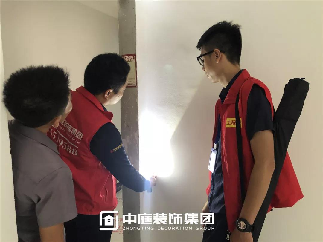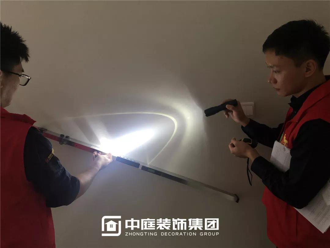 使用強(qiáng)光手電檢查陰角膩?zhàn)邮┕ご蚰デ闆r,工地大巡檢,不放過(guò)任何一個(gè)角落