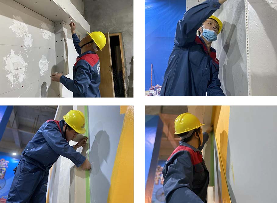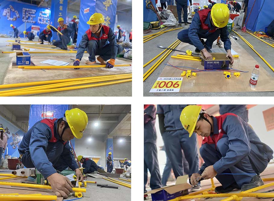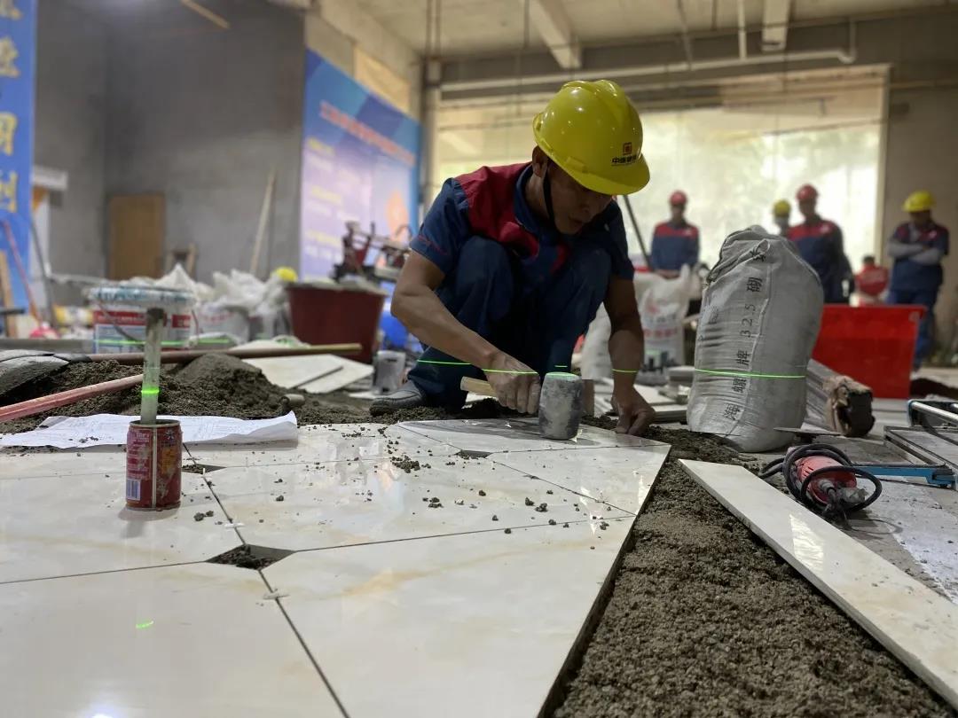 現(xiàn)場一共有土建組、水電組、瓦工組、膩子組四大工種賽區(qū),參賽選手在相對應(yīng)的工位,根據(jù)圖紙要求進(jìn)行比賽。