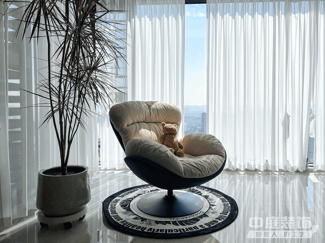 陽臺:為了不浪費南面的湖景,規(guī)劃開放式陽臺,用以解決洗衣和收納雜物的問題,放上躺椅休息時直面一片風景,身心舒暢。